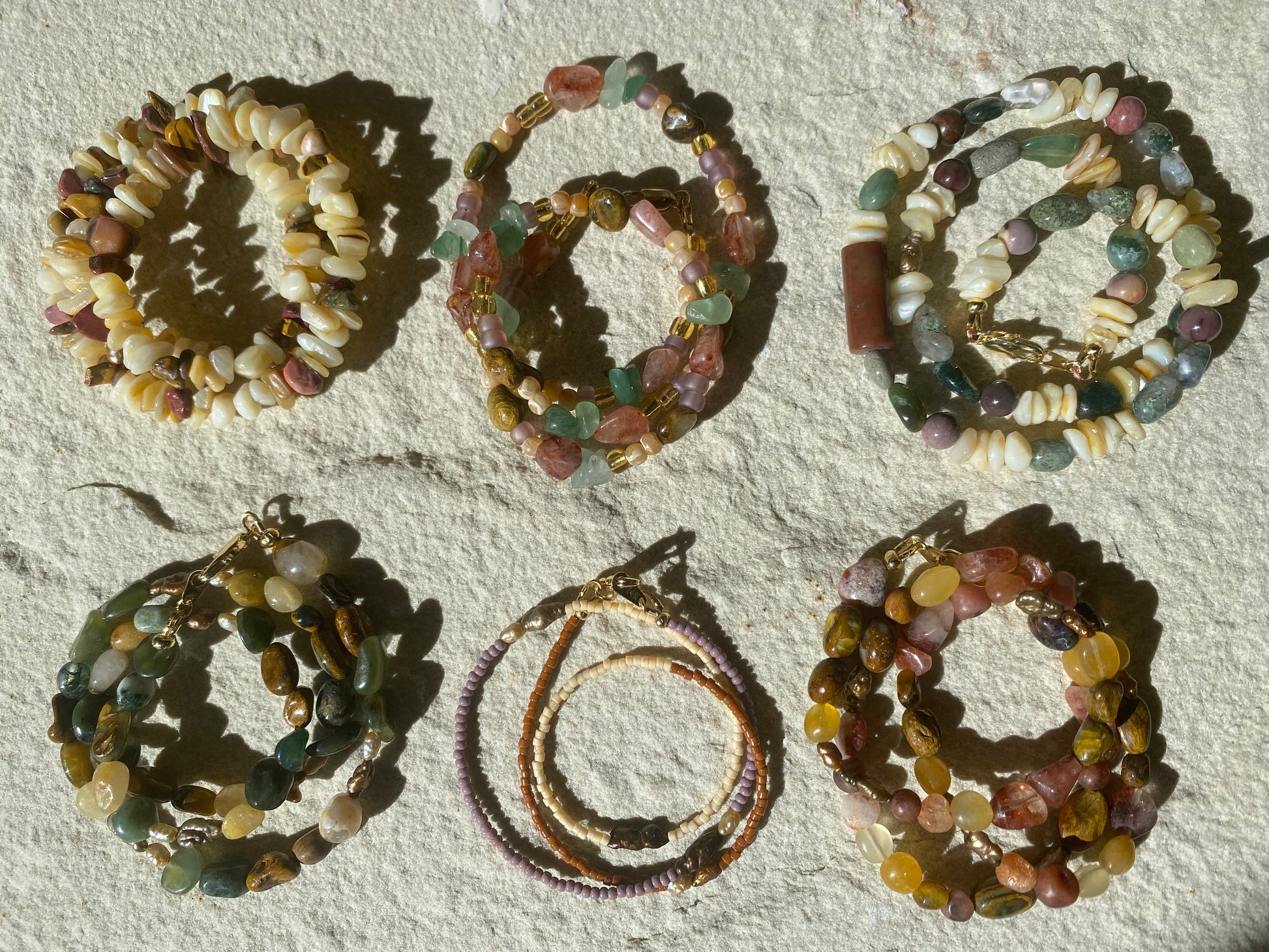 The Verdant Pearl Gemstone Necklace is a combination of Seafoam, Sage and golden Citrine. Gemstones include Moss Agate, Canadian Jade, and yellow Jade. The combination also includes a scatter of fair trade Japanese rice pearls.